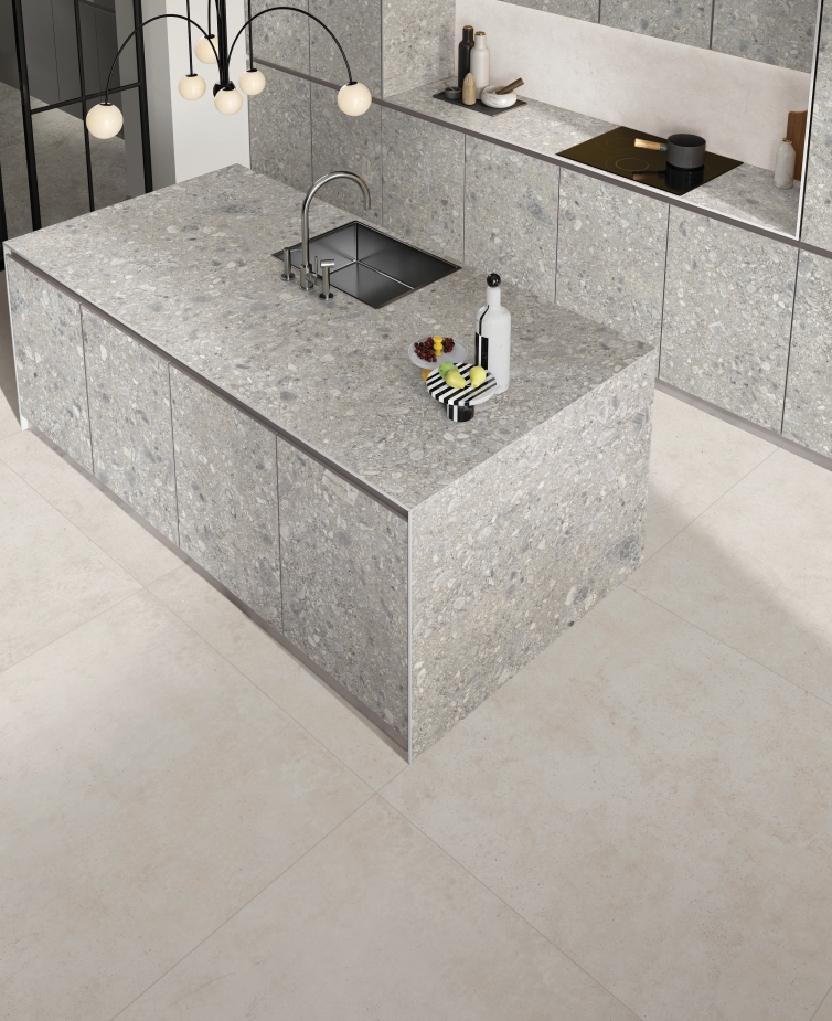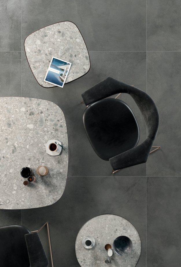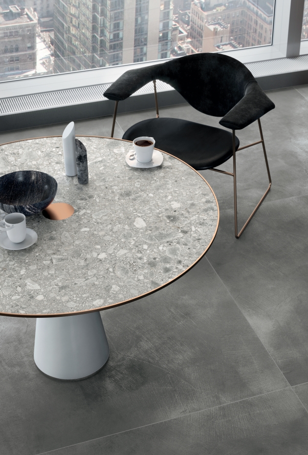 • 水磨石本身的斑驳的纹理与浅灰基底给人一种动静交织的体验,既带着水磨石的时尚,又有比水磨石更加高雅的贵气,外观时尚而典雅,细看细致温润。